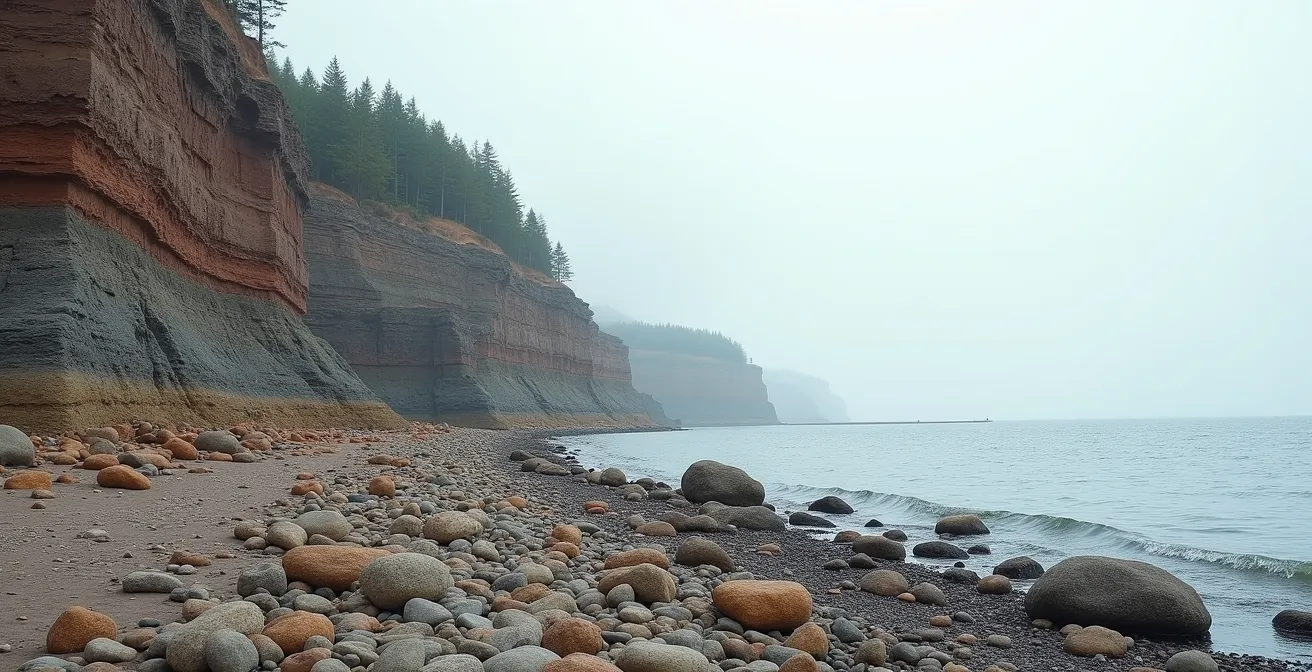 This daily scouring by trillions of tonnes of water is what shapes the entire coastline. While this force is slowly grinding the Hopewell Rocks into sand, at Joggins, it serves a different purpose. The 15 kilometres of cliffs at Joggins are composed of sedimentary rock from the Carboniferous Period. The relentless tidal action constantly erodes the base of these cliffs, causing sections to shear off and fall to the beach below. Every storm and every spring tide reveals a fresh layer of rock, exposing new fossils that were locked away for over 300 million years.